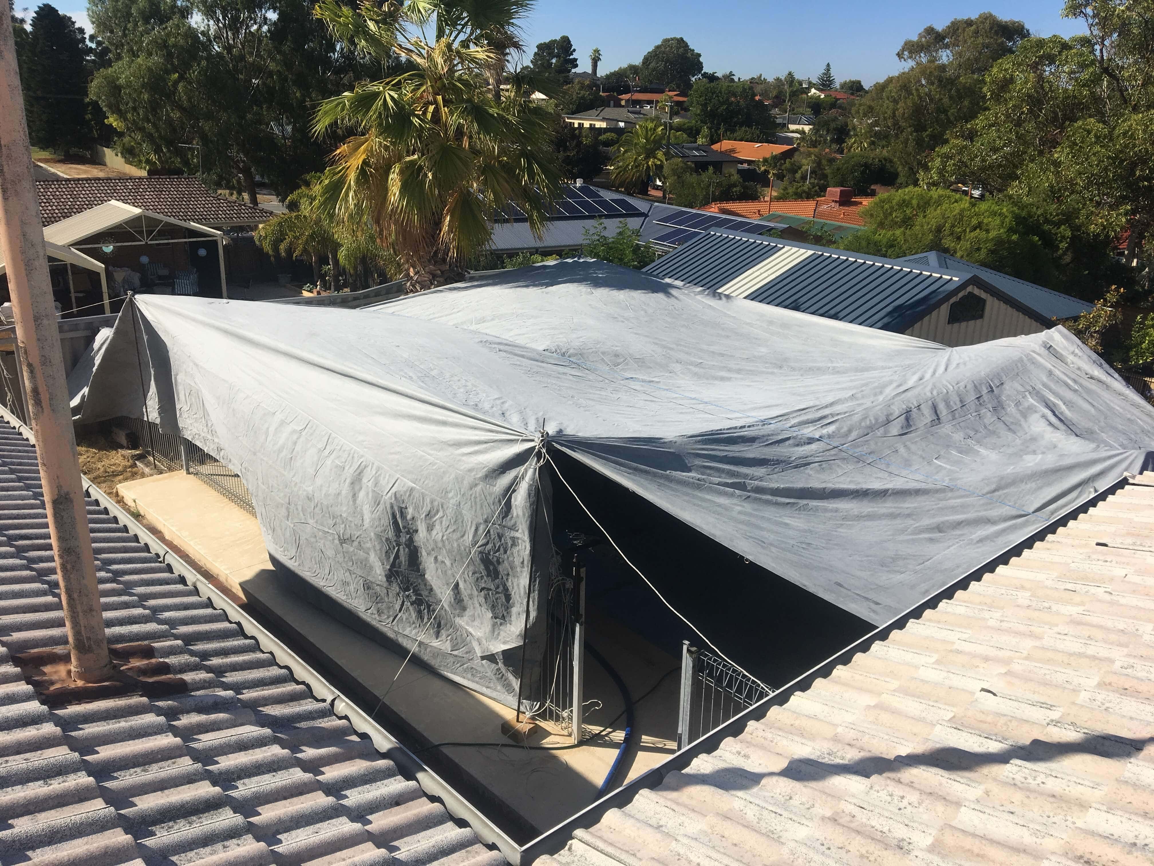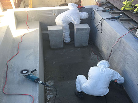Prior to grinding, a large tarp is erected over the pool to assist with containing dust and fibres. This helps to ensure a clean and safe work site.