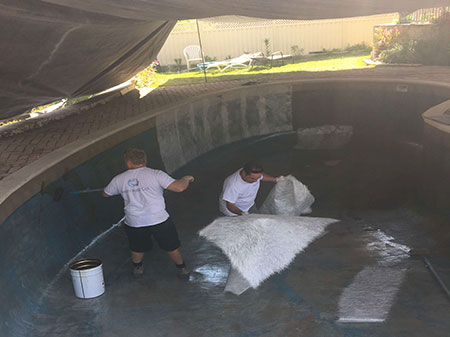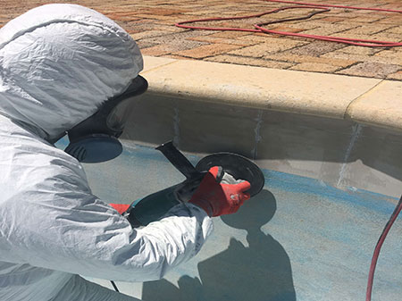 The pool is then emptied and prepared for grinding off the old plaster and flaking paint. It is then Diamond Key cut.